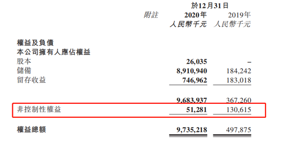 在股东权益的占比上,两者增幅也有很大差别。2019年归母权益为3.67亿元,2020年增至96.83亿元,增长了25倍,而少数股东权益2019年为1.3亿元,2020年为0.51亿元,大跌60%。