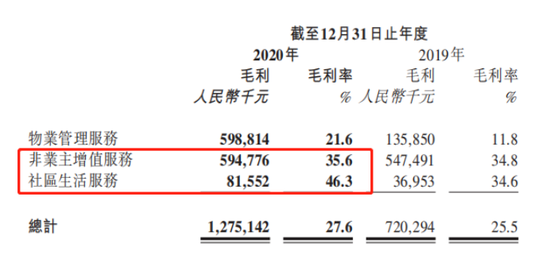 2020年,物业管理服务、非业主增值服务、社区生活服务的毛利分别为5.99亿元、5.95亿元、0.82亿元,物管毛利几乎与非业主增值服务相等,但毛利率却难同日而语。
