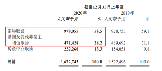 非业主增值服务收入比重的下降,主要源于其两大收入重头的减弱。财报显示,2020年作为主要收入来源的“案场服务”,收入虽增,但比重有所下滑,从59.1%下滑至58.5%;而第二大收入贡献力量的“咨询及其他非业主增值服务”,收入、比重双双下降,收入从4.90亿元下降至4.71亿元,近2000万的降额使得占比下滑了2.9%。
