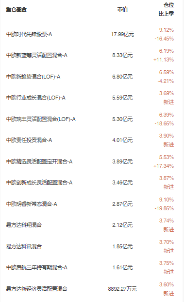 持仓最多的基金是周应波管理的中欧时代先锋股票-A,持有18亿元,占总持仓的9.12%。截止至3月9日该基金近三个月的收益为7.62%。