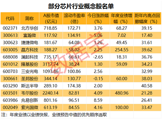 此外,在已公布年度业绩的个股中,不少芯片概念股在业绩向好的背景下,近期股价出现了较大幅度的调整。晶方科技股价较年内高点回撤39.62%,位居榜首;北方华创、圣邦股份、澜起科技等个股回撤幅度居前。除富瀚微和韦尔股份外,其余个股的回撤幅度也均超过了30%。