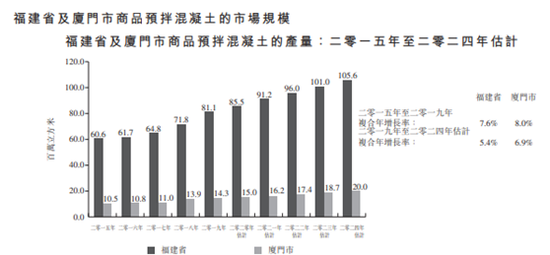 智欣集团成立于2007年,主要产品分为预拌混凝土、预制混凝土构件。据弗若斯特沙利文报告显示,以2019年按产量计,智欣集团是厦门市最大的预拌混凝土制造商及供应商,占有的市场份额约为7.2%。