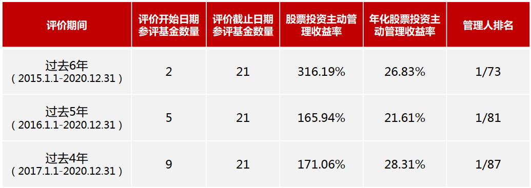 注:排名数据来自银河证券2021.1.1发布的《公募基金管理人长期主动股票投资管理能力榜单》。参评基金包括:1、股票投资下限大于等于80%,业绩比较基准中的股票指数是主流指数而非行业股票指数。2、股票投资下限大于等于60%,业绩比较基准中的股票指数是主流指数而非行业股票指数。3、股票投资下限没有80%或者60%的规定,但业绩比较基准的股票比例值大于等于60%,业绩比较基准中的股票指数是主流指数而非行业股票指数。4、历史上的54只老封闭式基金与几只创新封闭式基金,虽然按照新的股票基金标准不能划分为股票基金,但传统上这批封闭式基金是视为股票方向基金来对待的。