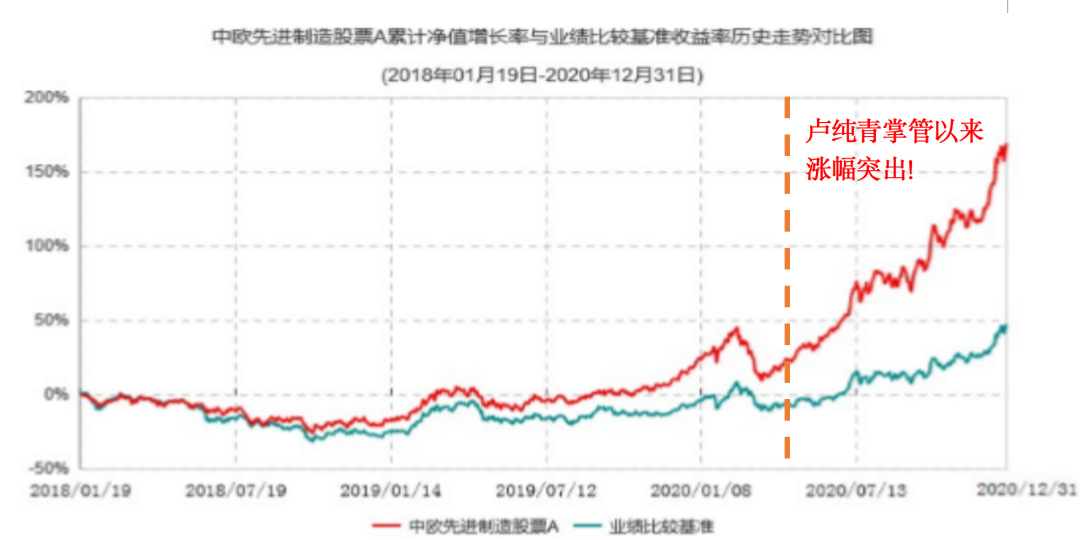 中欧先进制造A成立于2018/1/19,2019年—2020年来涨跌幅与业绩比较基准分别为49.03%/28.90%、125.66%/58.15%、197.31%/63.49%,中欧先进制造历任基金经理为:于浩成(2018/1/19-2020/6/24)、卢纯青(2020/6/24-至今)。