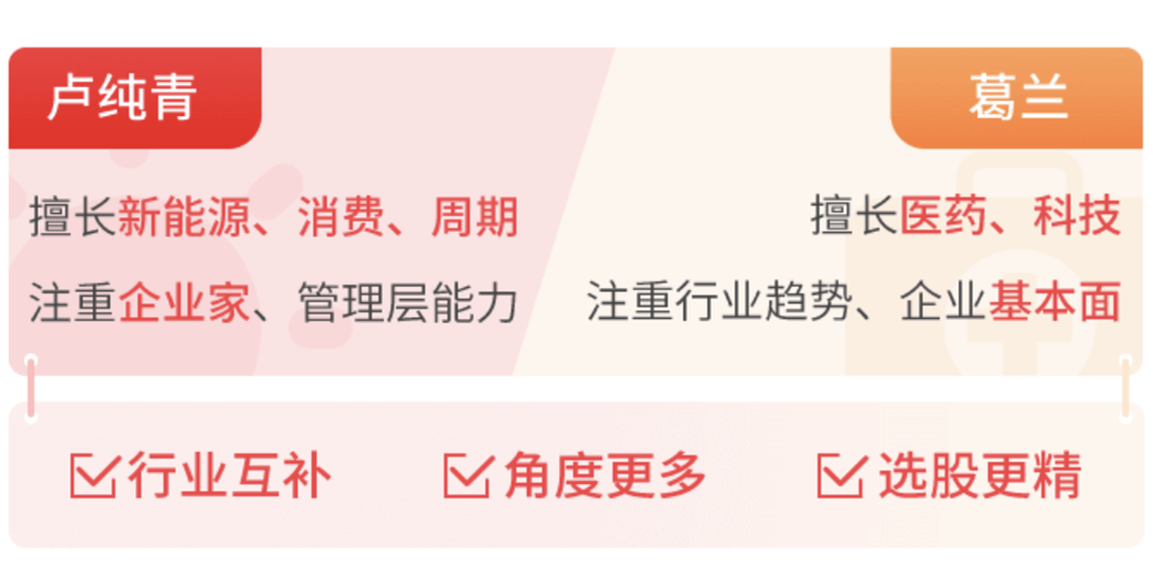 在行业配置方面,两位基金经理在行业研究上各有所长,优势互补。卢纯青擅长新能源、消费、周期,葛兰擅长医药、科技等行业,合作管理这只全行业基金再适合不过。