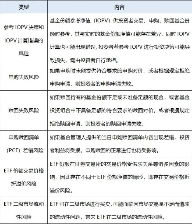 ETF特有风险主要包括参考IOPV决策和IOPV计算错误的风险、申购失败风险、赎回失败风险、申购赎回清单(PCF)差错风险、ETF份额交易价格折溢价风险、ETF二级市场流动性风险及ETF退市风险等,具体如下表所示: