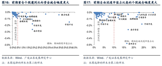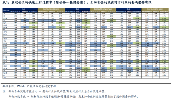 从个股层面来看,在过去三轮快速上行过程中(除去第一轮建仓期),北向资金均主要从前期重仓的个股中流出。从历史数据可以看出北向资金主要从前期持仓市值占比大于等于0.5%的个股中撤退。在第二轮中,北向资金减持的股票共694只,其持仓比例变化总和为-3.87%,而前期持仓市值占比大于等于0.5%的个股共30只,遭到减持的有18只,这18只的持仓比例变化总和便达到了-1.79%。在第三轮中,前期持仓市值占比大于等于0.5%的个股共32只,16只遭到减持,持仓比例变化为-2.25%,而期间北向资金减持的股票达到743只,持仓比例变化为-3.88%。在第四轮中也同样如此,共减持979只股票,持仓变化比例为-4.99%,而前期重仓的个股共30只,28只遭到减持,持仓变化比例为-2.25%。期初持仓占自由流通市值比重高(大于等于10%)的个股也会受到一定影响。以第二轮为例,前期持仓市值占个股自由流通市值比例超过10%的个股共29只,其中遭到减持的股票有16只,持仓变化比例为-1.34%。在其他轮次当中,也是类似的情况,北向资金主要减仓的个股大多也是期初持仓占自由流通市值比重较高的股票。北向资金在过去三轮(加上拆开看的持续流出阶段,共六轮)减仓前20名中,A股优质上市公司多次上榜。其中,中国平安6次均遭到卖出,贵州茅台、招商银行、中国中免5次遭到卖出,格力电器、工商银行、海尔智家、恒瑞医药、京东方A、上海机场、万科A、洋河股份4次遭到卖出。但是由于北向资金的减仓幅度并不是特别大,这些公司大多又是重仓持股,因此这些公司总体受到的影响有限,但在微观结构相对脆弱的当下,仍需关注北向流出其重仓股股价的扰动。
