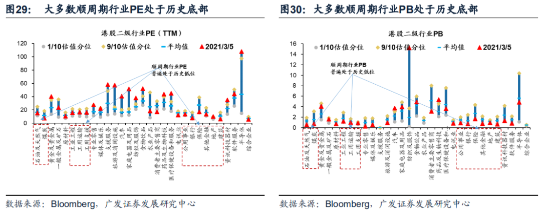 整体承压背景下港股存在结构性投资机会,顺周期行业(尤其是金融地产)的分子分母端优势体现。首先,港股的风格自20H2以来已有所转变,整体微观结构要优于A股,尽管部分热门股仍存在一定的结构调整压力,但其他板块仍有结构性机会。其次,从DDM模型来看,港股顺周期行业具备分子端和分母端的优势:(1)分子端,全球经济复苏背景下,大宗商品价格显著上行,原材料、地产、工业等行业业绩有望从中受益,根据2021年预测净利润增速以及ROE来看,多数顺周期行业业绩预期良好;(2)分母端,港股估值呈现极度分化的状态,科技、消费行业估值均处于历史极高位,反观石油天然气、煤炭、原材料、地产、银行、保险、其他金融等顺周期行业估值普遍处于历史底部,由此有望对冲无风险利率上行带来的DDM估值模型分母端的压力,为分子端拉动力锦上添花。