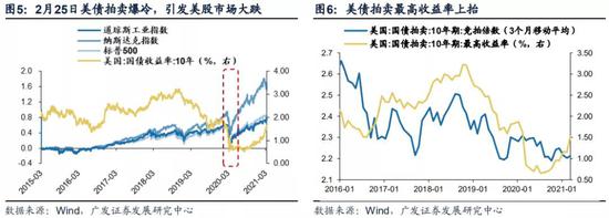 投资人对收益率的要求明显提升。我们可以从近期的几次美债拍卖来大概探知当前投资人的收益率预期。2月25日,美国财务部拍卖7年期国债,投标倍数仅为2.04创历史新低,得标利率为1.195%(票面利率1.13%,预发行收益率1.151%),前一日10Y美债收益率为1.37%,在本轮拍卖后飙升至1.54%。而3月10日的美债拍卖,10年期美债的投标倍数为2.38,得标利率为1.523%,也是2020年2月以来最高,当日美债收益率为1.53%。从两轮拍卖大概可以探知当时对投资人较有吸引力的10Y美债收益率起码在1.5%以上。