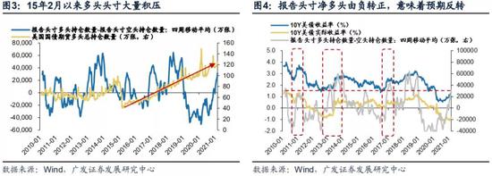 多头头寸大量积压,报告头寸净多头由负转正意味着预期反转,此前被推升至估值高位的美债持仓承压。过去几年,美债收益率的趋势性下行,以及在2020年疫情冲击下的加速回落,吸引资金大量增配美债,截止3月2日,美国国债期货多头持仓数量为122.84万张,达到历史高位。此前快速积累的头寸利率反转的趋势之下面临较大压力。近期报告美债期货头寸净多头由负转正,意味着非报告类的投资者(机构/个人)的空头开仓增加。从历史数据来看,每一次报告头寸净多头由负转正都伴随着10Y美债收益率加速上行。近期报告头寸净多头再次由负转正,意味着市场预期反转,10Y美债收益率转为上行趋势,前期被推升至估值高位的美债持仓承压。