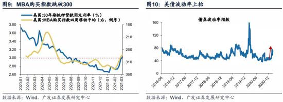 美债波动正超越基本面因素,谨慎关注美债收益率上行超预期的可能性。当前美债收益率正超越基本面因素,对经济前景的看好和对通胀的担忧不足以解释当前美债收益率的上行斜率。微观结构恶化引发美债短期波动超预期。另外,当前美债波动率虽然没有到达历史高位,但呈现上升趋势,当收益率加速波动时,凸性对冲等行为可能会进一步推升波动上行。