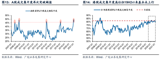 但在经济复苏、利率上行的当前,短期的宏观组合形成了长期宏观组合的反向,推动风格均衡化演绎。可以看到美股自20Q4以来由前期强势的大盘股转为小盘股跑赢,港股自20H2以来由前期的科技医药转为顺周期领涨,风格均发生了一定的均衡。而A股自20H2以来,尽管顺周期明显补涨,但前期强势的新能源、食品饮料、休闲服务等在本轮调整之前依旧占据榜首。从成交热度来看,A股成交额前5%的公司占整体成交额的比重再次触发了45%阈值;港股成交集中度也位于高位,但自19H2以来基本稳定,未见进一步升高。从市场表现来看,本轮美债利率上行构成的压力测试中,相关性最低、中债利率保持平稳的A股反而调整最为剧烈,反映A股当前的微观结构更为糟糕。