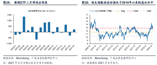 业绩向上弹性不足时,估值高位会使得折现率上行的压力体现得更为明显。折现率快速上行时,远期现金流价值减弱,在业绩增长动能不足时,高估值成长股受到的影响更大。当前港股估值相对较高,恒生指数动态PE于2月一度超过2010年以来的90%分位数。在此背景下美债收益率上行的压力被放大。21年2月伴随美国国债收益率的升高,港股资金面趋紧,港股ETF单月净流出2.9亿美元,创下了自2020年6月以来的最大净流出量。