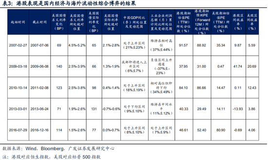 港股表现受国内经济和海外流动性的双重影响。港股作为离岸市场,大部分资产来自于中国大陆,而主要投资者则来自海外,这便造成了港股上市企业盈利能力受到国内经济环境影响但折现率却与海外无风险利率紧密相连。在此情况下,当国内经济和企业盈利能力快速上行同时海外无风险利率下行时,港股盈利与估值双击,往往有较好表现。而当海外无风险利率快速上行时,港股企业DDM模型分母端承压,此时港股表现主要由国内经济与海外流动性综合博弈的结果决定:(1)若同期国内经济与企业盈利能力将走弱,则港股公司面临业绩与估值双杀;(2)若同期国内经济与企业盈利走强,港股的最终表现与二者弹性有关。