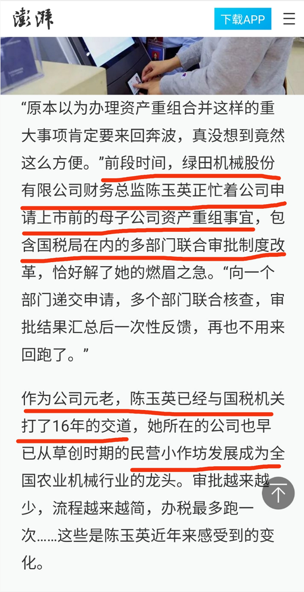 在国家税务总局开设的澎湃政务号上,在2018年5月7日曾发布过一篇《各地不断优化税收营商环境 助力企业发展》的文章,其中提到“前段时间,绿田机械股份有限公司财务总监陈玉英正忙着公司申请上市前的母子公司资产重组事宜,包含国税局在内的多部门联合审批制度改革,恰好解了她的燃眉之急。”
