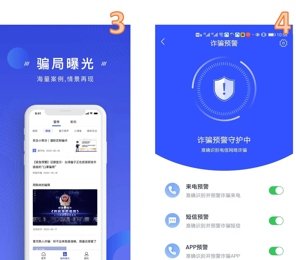 当您收到可疑诈骗分子的来电、短信及短信内容、网址、包括安装可疑诈骗APP应用时,它可以智能识别骗子身份并提前预警,大大降低您受骗的可能性。