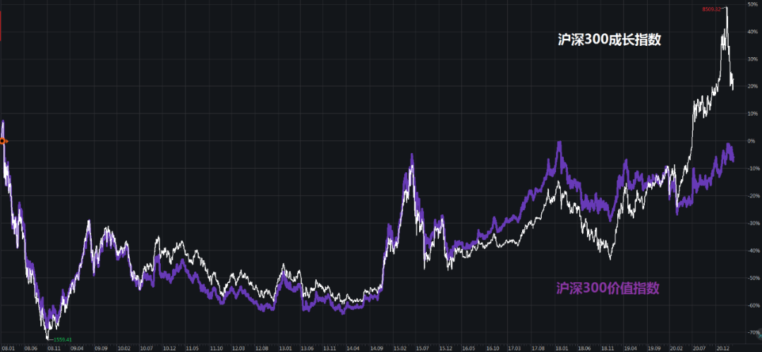 图一:2008年以来沪深300成长指数(白线)与沪深300价值指数(紫线)走势对比