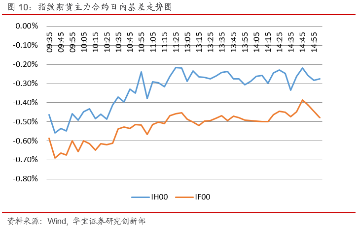 日内基差方面,上证50指数期货和沪深300指数期货主力合约的日内基差窄幅震荡,最后分别收于-0.28%和-0.48%。