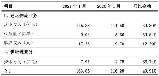 顺丰控股近期发布的经营简报显示,公司2021年1-2月累计速运物流及供应链收入合计为275.95亿元,较去年同期增长33.72%;2021年1-2月累计速运物流业务量合计为16.02亿票,较去年同期增长53.89%。