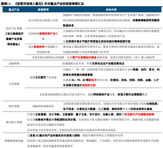 4月8日,发改委印发《关于支持海南自由贸易港建设放宽市场准入若干特别措施的意见》(下简称《意见》),这是自年初修订海南自贸港外商投资负面清单之后,短短3个月内对于市场准入措施的二轮放宽。本次《意见》重点针对医药卫生、金融、文化、教育、航天航空、种业、新能源基础设施和乡村旅游等重点产业进行了放宽布局。