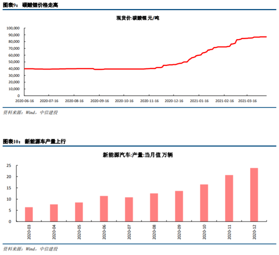 国际供给收缩,锂价持续攀升。截至2021年4月8日,国内碳酸锂的现货价格为87000元/吨,年初以来涨幅已达74.00%,2020年6月至今涨幅为118.05%。同时,市场六氟磷酸锂的价格为200000元/吨,年内涨幅为81.82%。而从国内产量上来看,2月份产量相较于去年12月份总体下降15.61%.。此外,受第二大锂矿出产国智利的封国影响,一季度锂进口或有明显缩减,供给紧平衡为价格上行带来支撑。需求面来看,下游新能源汽车企业月产量自2020年9月以来有显著提升,未来随着新能源汽车产业的快速崛起,下游企业对锂原料的需求也将持续增加,进一度推动锂价上涨。