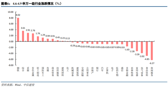 申万一级行业方面,钢铁、综合、采掘、有色、轻工、军工、传媒、商业贸易、纺织服装、建筑材料、化工本周收涨,其中钢铁指数涨幅超8%,采掘、有色涨幅近3%。而休闲服务、食品饮料、电气设备、家用电器、农林牧渔等核心资产集中标的跌幅居前,跌幅均超2%。