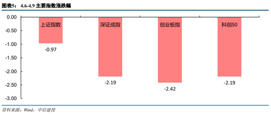 4月6-9日,A股市场呈现出缓慢下跌的特征。上证综指、深成指、创业板指、科创50分别下跌0.97%、2.19%、2.42%和2.19%。从行业的层面来看,钢铁呈现出显著的反弹,本周涨幅达到8%,其次是采掘2.19%和有色2.76%。电器设备、食品饮料和休闲服务呈现出了显著的下跌。从4月整体来看,市场呈现出温和反弹的格局,核心资产和周期板块都存在着交替。