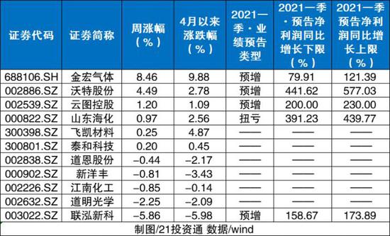 目前化工行业景气度较高,一季报有较多业绩方面的利好。开源证券研报指出,从目前统计的已披露一季报业绩预告的73家化工板块上市公司来看,2021年一季度整体预计实现净利润145.45-161.60亿元,预计同比增长389.2%-443.5%,预计环比增长166.9%-196.6%,化工板块整体业绩预计将同比大幅改善、环比继续保持高增长。
