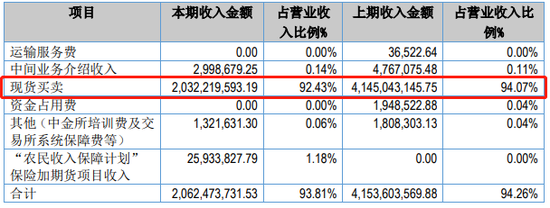 然而,渤海期货营业收入为21.99亿元,但其他业务收入中列示的“现货买卖”项,当期收入为20.32亿元,占比高达94.26%。