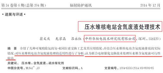 该文的署名作者是翁文庆、龙京晶和吕永红三位。值得关注的是,这三位作者均任职于中国广核(003816)旗下全资子公司中科华核电技术研究院有限公司(现已更名为“中广核研究院有限公司”)。由此可见,中国广核(003816)在国内含氚废水处理的技术方面,显然是处于绝对领先地位!