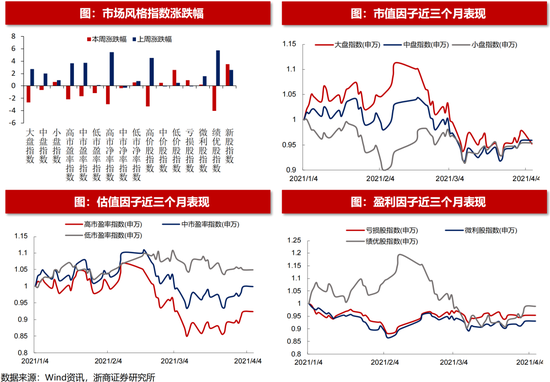 上周小盘指数、低PE指数、低价股指数、亏损股指数表现相对占优。上周市值风格中,大盘/中盘/小盘指数涨跌幅分别为-2.67%、-0.63%、0.63%。PE风格中,高PE/中PE/低PE指数涨跌幅分别为-2.19%、-1.69%、-1.18%。股价风格中,高价股/中价股/低价股指数的涨跌幅分别为-3.31%、0.47%、2.56%。盈利风格中,亏损股/微利股/绩优股指数的涨跌幅分别为0.95%、0.21%、-4.02%。