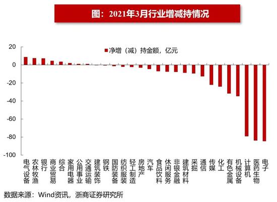 净增持行业:电气设备、农林牧渔、银行、商业贸易、家用电器、公用事业、交通运输等;