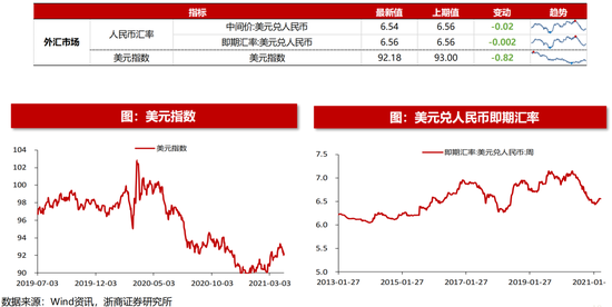 上周美元指数下降,人民币对美元升值。上周美元指数为92.18(-0.8)。美元兑人民币即期汇率为6.56(-0.002)。