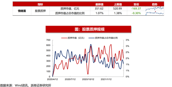 上周股票质押占总市值的比例下降。上周质押市值为351.6亿元(-169.37亿元),质押市值占总市值的比例为1.07%(-0.3%)。