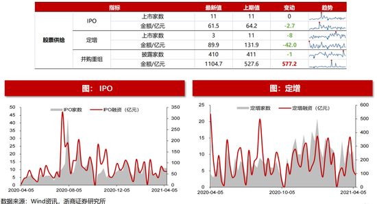 上周IPO上市家数不变,定增家数减少,并购重组家数减少。上周IPO上市有11家(+0家),金额61.5亿(-2.7亿元)。定增有3家(-8家),金额89.9亿元(-42)亿元。并购重组有410家(-1家),金额1104.7亿元(+577.2亿元)。