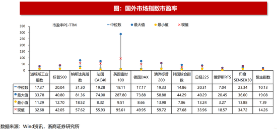 上周道琼斯工业指数、标普500、纳斯达克指数、法国CAC40、英国富时100、德国DAX、澳洲标普200、韩国综合指数、日经225、俄罗斯RTS、印度SENSEX30、恒生指数的市盈率分别为32.68、42.05、57.62、55.93、95.61、49.95、59.72、27.68、33.96、18.57、34.72、14.26。过去十年分位数分别为99.8%、100%、94%、97.2%、93.8%、97%、99.8%、92.5%、94.6%、99.5%、97.7%、94.9%。