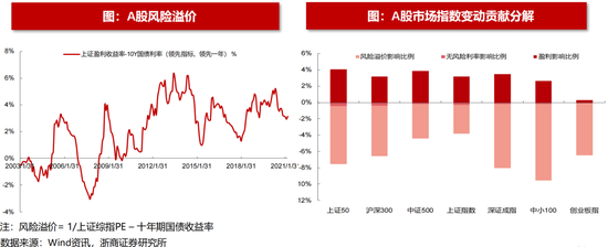 今年以来上证50、沪深300、中证500、上证指数、深圳成指、中小板指、创业板指涨跌幅受盈利影响的比例分别为4.08%、 3.2%、 3.89%、 3.2%、 3.48%、 2.66%、 0.28%,受无风险利率影响的比例分别为-0.43%、 -0.39%、 -0.21%、 -0.28%、 -0.22%、 -0.21%、 -0.11%,受风险溢价影响的比例分别为-7.12%、 -6.19%、 -4.18%、 -3.56%、 -7.81%、 -9.35%、 -6.33%。