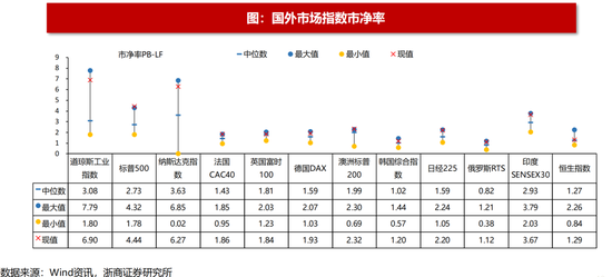 上周道琼斯工业指数、标普500、纳斯达克指数、法国CAC40、英国富时100、德国DAX、澳洲标普200、韩国综合指数、日经225、俄罗斯RTS、印度SENSEX30、恒生指数的市净率分别为6.9、4.44、6.27、1.86、1.93、2.32、1.2、1.2、2.2、1.12、3.67、1.29。过去十年分位数分别为99.8%、99.9%、97.4%、99.9%、61.5%、98.7%、99.8%、90.1%、99.6%、97.6%、97.7%、57%。