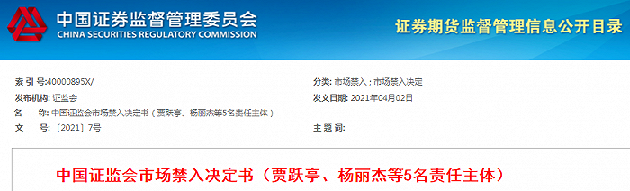 4月13日,证监会官网披露《中国证监会市场禁入决定书(贾跃亭、杨丽杰等5名责任主体)》。据此,鉴于乐视网3(400084.OC) 实际控制人,时任乐视网董事长贾跃亭、时任乐视网财务总监杨丽杰违法情节特别严重,依据《证券法》和《证券市场禁入规定》规定,证监会决定:对贾跃亭、杨丽杰采取终身证券市场禁入措施。