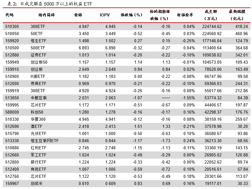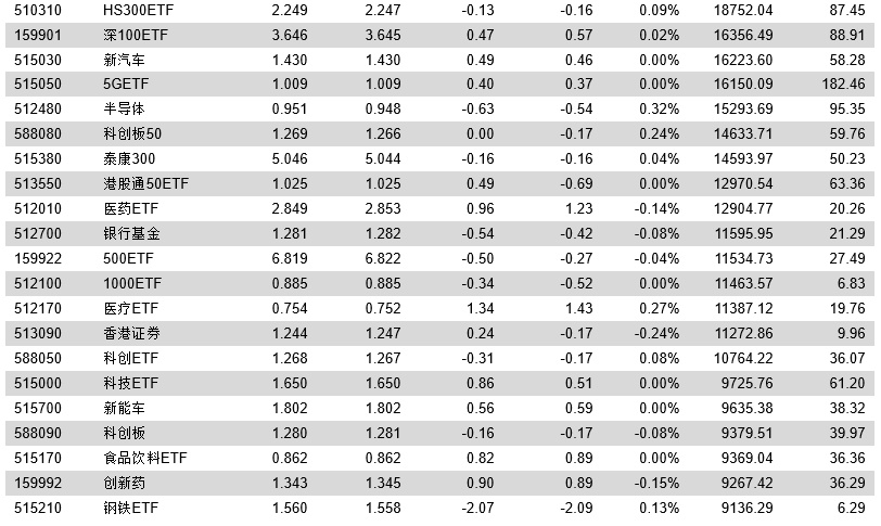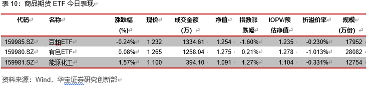 今日有色ETF成交额1258.04万元,收盘上涨0.08%,预估折价率1.013%;豆粕ETF成交额1334.61万元,收盘下跌0.24%,预估折价率0.230%。