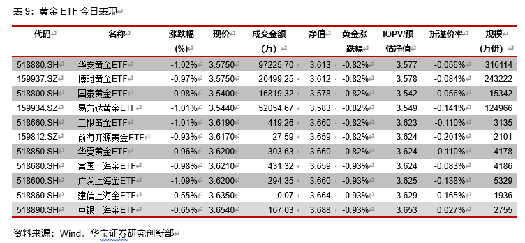 今日国内黄金AU9999收盘下跌0.82%,上海金收盘下跌0.93%,黄金ETF中,华安黄金ETF下跌1.02%,预估折价率0.056%。今日白银期货主力合约下跌1.53%,白银基金下跌1.05%,预估折价率0.39%。