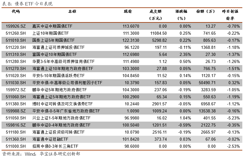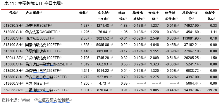 QDII-ETP方面,上日德国DAX指数下跌0.13%,标普500指数下跌0.02%,纳斯达克100指数下跌0.19%。今日收盘华安德国30ETF下跌1.83%,预估溢价率0.01%;博时标普500ETF下跌0.04%,预估溢价率0.30%;国泰纳斯达克100ETF下跌0.22%,预估折价率0.45%。