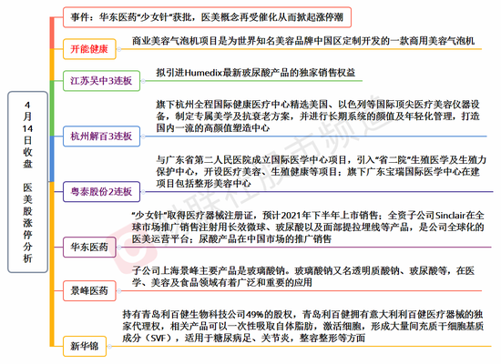 4月13日晚,华东医药公告称,英国全资子公司Sinclair收到了国家药品监督管理局颁发的《医疗器械注册证》,产品名称为注射用聚己内酯微球面部填充剂(俗称“少女针”),预计将于2021年下半年在中国大陆正式上市销售,这一事件是今日医美板块大涨的诱因。此前,华创证券高岳团队分析认为,少女针注射后可即时起效,从消费者使用直接感受效果来看优于童颜针,该产品更受医美机构欢迎。