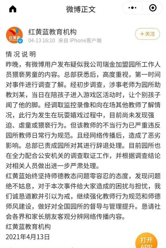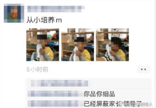 4月12日,有网友爆料称,当日江西瑞金市红黄蓝城东幼儿园教师刘某脱鞋进入“娃娃家”活动区域,有小朋友说他脚臭,刘某低头闻了自己的脚,然后抬起脚让小朋友闻,自己用手机拍照发了朋友圈,同时配文“从小培养m”,并在留言中称“你品你细品”“已屏蔽家长领导”。