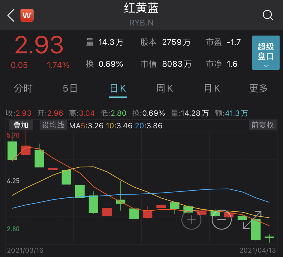 在美股上市的红黄蓝教育,4月12日股价暴跌15.29%,报收2.88美元,较3月12日时的年内高点5.91美元累计下跌51.27%。而如果与发行价18.5美元相比,其跌幅达到84.83%。4月13日,其股价略有反弹,报2.93美元。