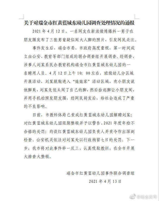 江西省瑞金市教科体局成立了联合调查组介入调查。4月13日晚间,瑞金市委宣传部官方微博发布调查情况通报称,市教科体局已责成红黄蓝城东幼儿园解聘刘某;对红黄蓝城东幼儿园限期整顿并予以警告、2021年度年检不合格的处罚;约谈红黄蓝城东幼儿园负责人并责令作出深刻检查。公安机关依法对刘某处以行政拘留七日的处罚。