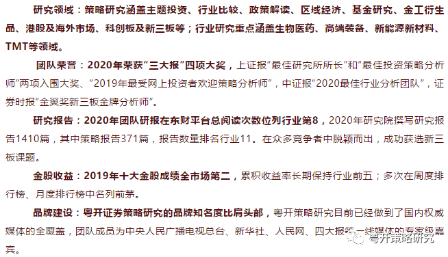 粤开证券研究院策略及行业团队具备完善的研究体系,观点鲜明,是高效且紧贴市场的实战型团队。2020年,策略与行业团队凭借专业及深度研究,赢得了市场的认可和尊敬。2021年,粤开证券研究院在大股东广州开发区控股的引领下将整装再出发,立足粤港澳大湾区,辐射全中国,造就一流特色精品研究!