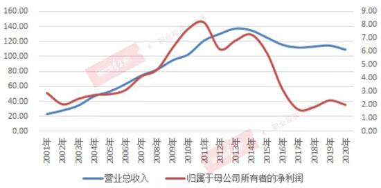 原因并不难解释,啤酒销量持续下降,导致其营收额不断萎缩。燕京啤酒最新公布的业绩预告显示,2020年,燕京啤酒实现营收109.2亿元,相比2013年的137亿缩水近30亿元。