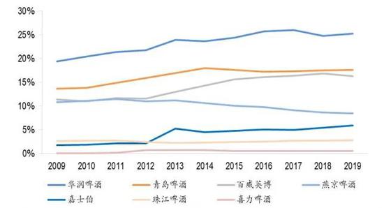 图4 2009-2019年中国各啤酒厂商市场份额变化