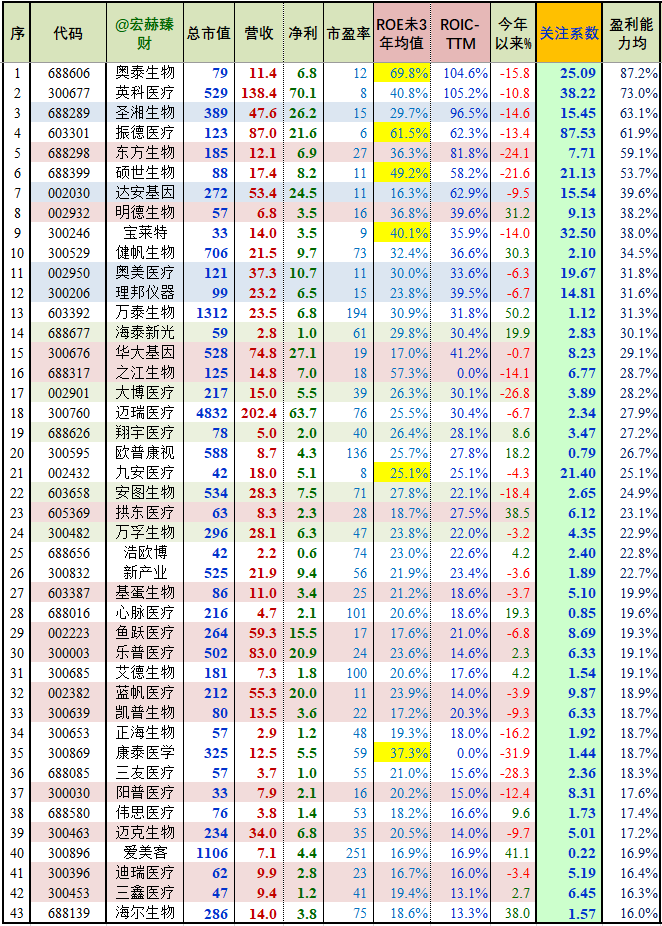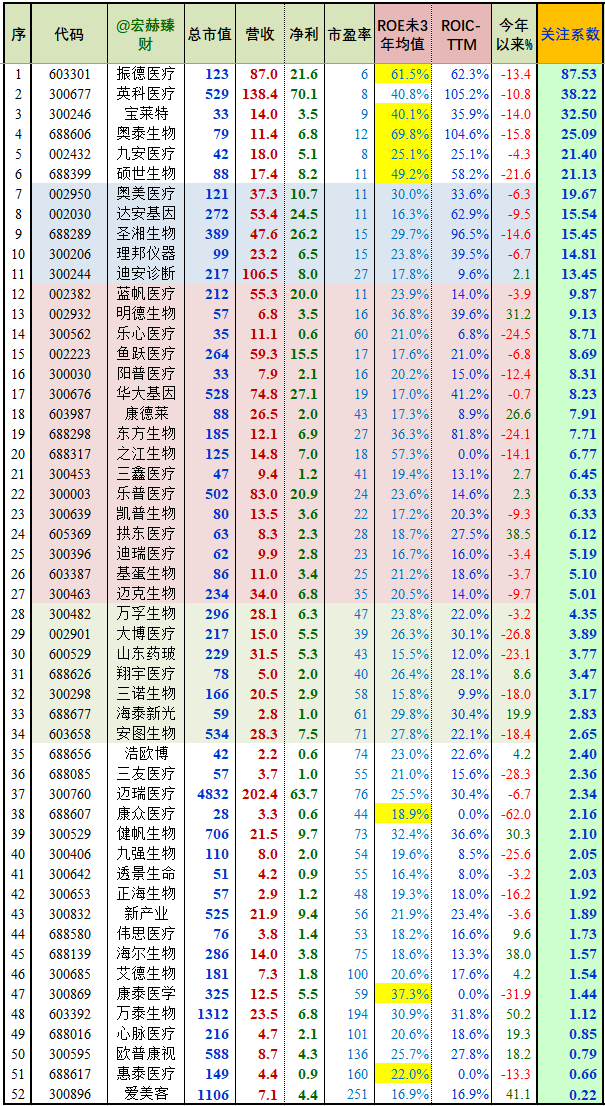 宏赫量化选股步骤1:剔除未来三年机构一致预期ROE总均值小于15%的企业;然后按照宏赫关注系数降序排列如下,初选1胜出公司:【52】家。
